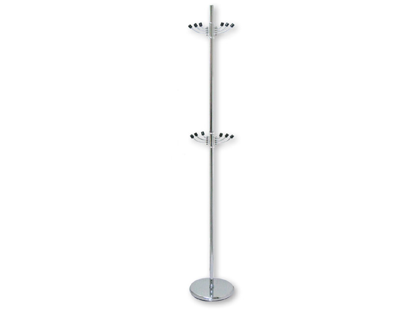 Καλόγερος ρούχων μεταλλικός, σε χρώμιο, με περιστρεφόμενα κρεμαστράκια και μαύρα ή λευκά τελειώματα.
