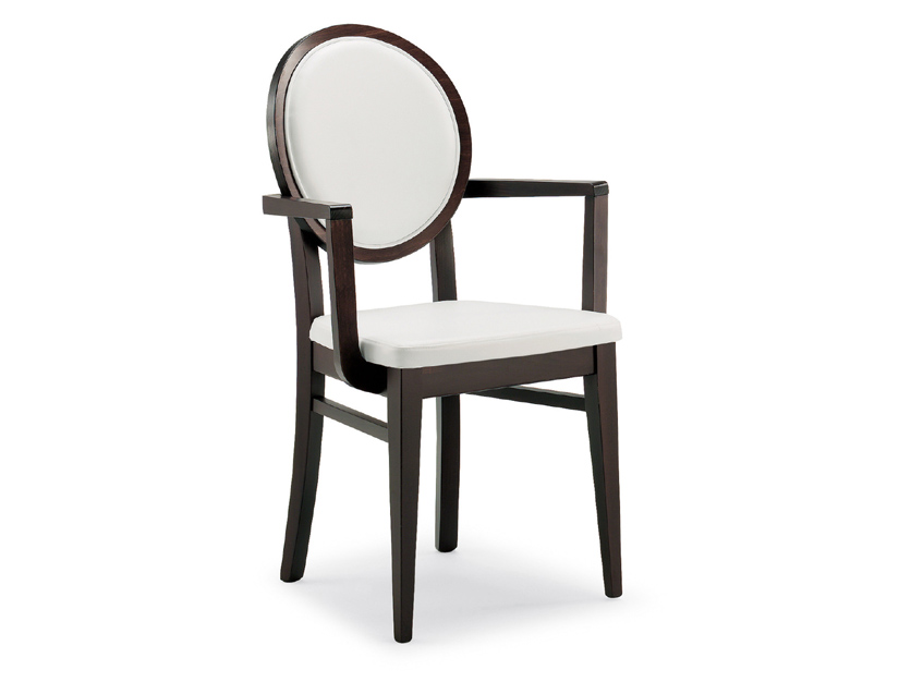 Πολυθρονοκαρέκλα Ιταλίας, ξύλινη από οξυά, με πλάτη στρογγυλή ντυμένη με ύφασμα και το κάθισμα ντυμένο με το ίδιο ύφασμα.
