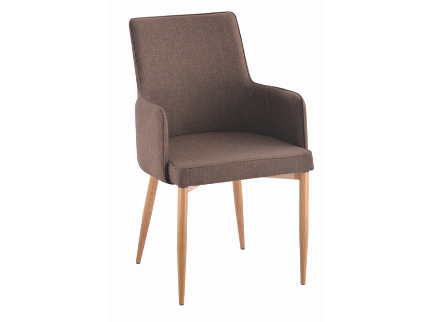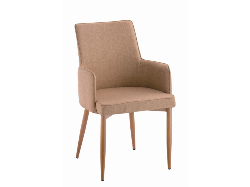 Πολυθρονοκαρέκλα τραπεζαρίας, ιδιαίτερα αναπαυτική, ντυμένη με ύφασμα σε καφέ ή ανοιχτό καφέ χρώμα. Τα πόδια είναι στρογγυλά,μεταλλικά, στην απόχρωση του δρυς.